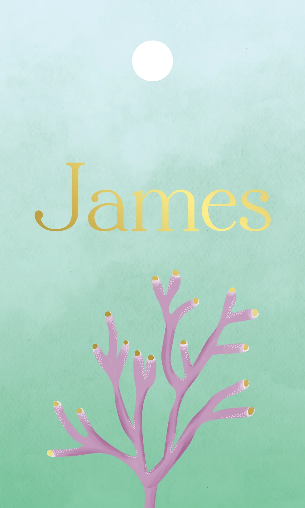 Label in zeethema, met lila koraal op een zeeblauw/groene achtergrond. Het label is afgewerkt met folie, in formaat 30 x 50mm. Perfect voor op doopsuiker, geboortebedankjes en traktaties.