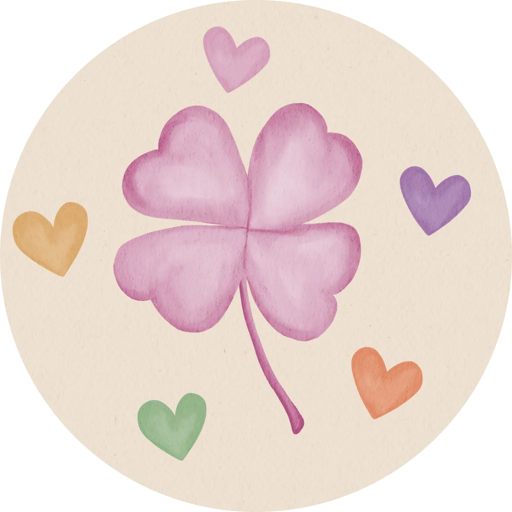 Lieve sluitsticker met een lila klavertje vier en pastelkleurige hartjes, perfect om je geboortekaartje mooi mee af te sluiten.