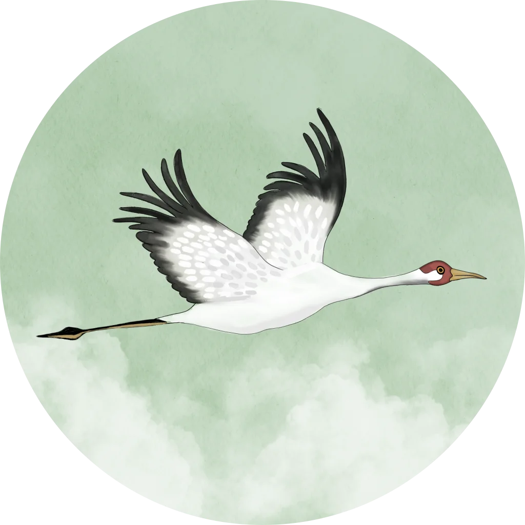 Sluitsticker met kraanvogeltje op een groene achtergrond met wolkeneffect, perfect om je geboortekaartje mooi mee af te sluiten.