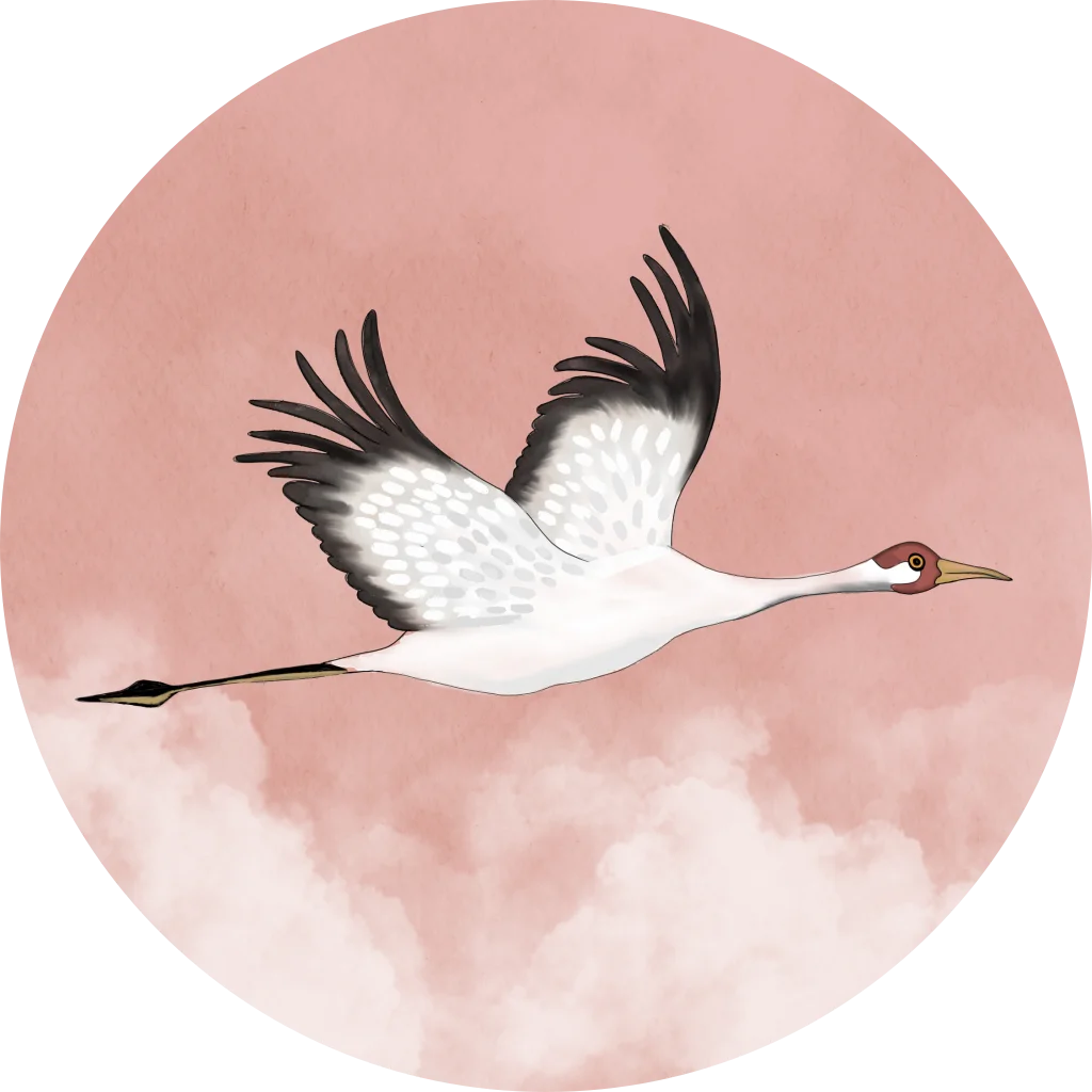 Sluitsticker met kraanvogeltje op een roze achtergrond met wolkeneffect, perfect om je geboortekaartje mooi mee af te sluiten.