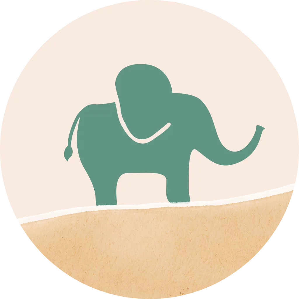 Schattige sluitsticker met een groen olifantje op een beige landschap, perfect om je geboortekaartje mooi mee af te sluiten.