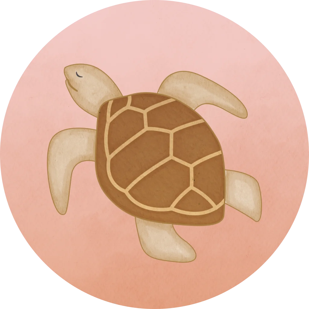 Schattige sluitsticker met bruin baby schildpadje op een roze/terra achtergrond, perfect om je geboortekaartje mooi mee af te sluiten.