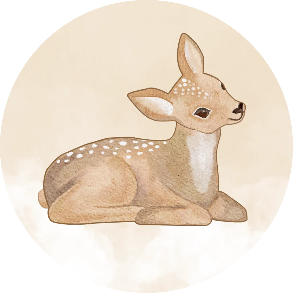 Schattige sluitsticker met een hertje op een beige achtergrond met wolkjes, perfect om je geboortekaartje mooi mee af te sluiten.