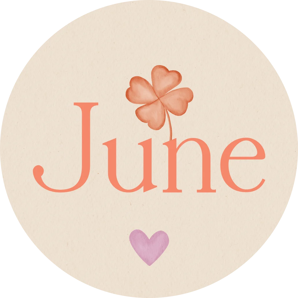 Lieve sticker met naam en klavertje vier in mooie oranje peach-kleur met lila hartje op beige achtergrond. Perfect voor op doopsuiker, geboortebedankjes en traktaties.
