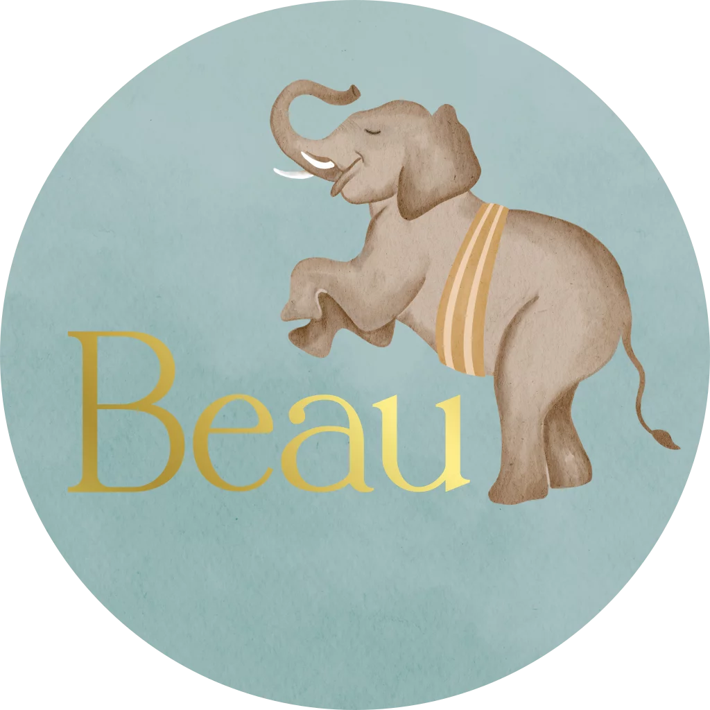 Mooie sticker met olifantje op blauwe achtergrond met naam van jullie kleintje in goudfolie. Perfect voor op doopsuiker, geboortebedankjes en traktaties.