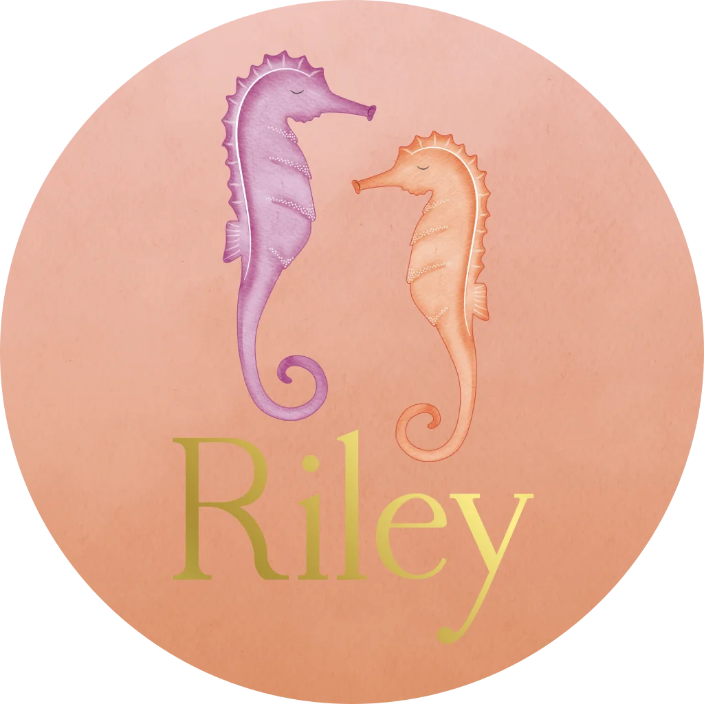 Schattige sticker met twee zeepaardjes in paars en koraalkleur op een terra roze achtergrond met naam in goudfolie. Perfect voor op doopsuiker, geboortebedankjes en traktaties.