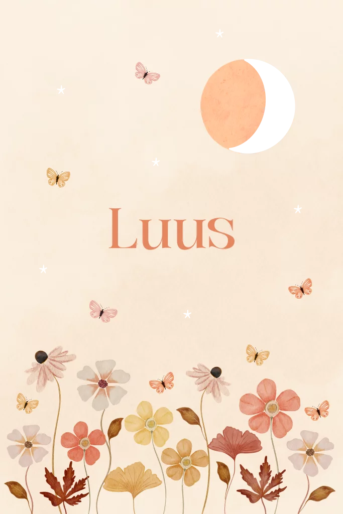 Lief geboortekaartje met bloemen en vlindertjes. Het kaartje heeft een maantje en sterretjes in goudfolie. De maan is aan te passen naar de stand van de maan op de dag van de geboorte.