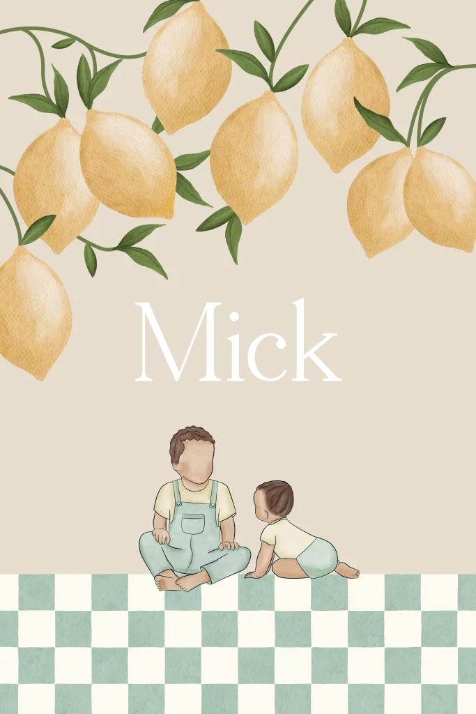 Geboortekaartje van twee broertjes op mooie groene tegeltjes met citroenen. De naam is afgewerkt in goudfolie.
