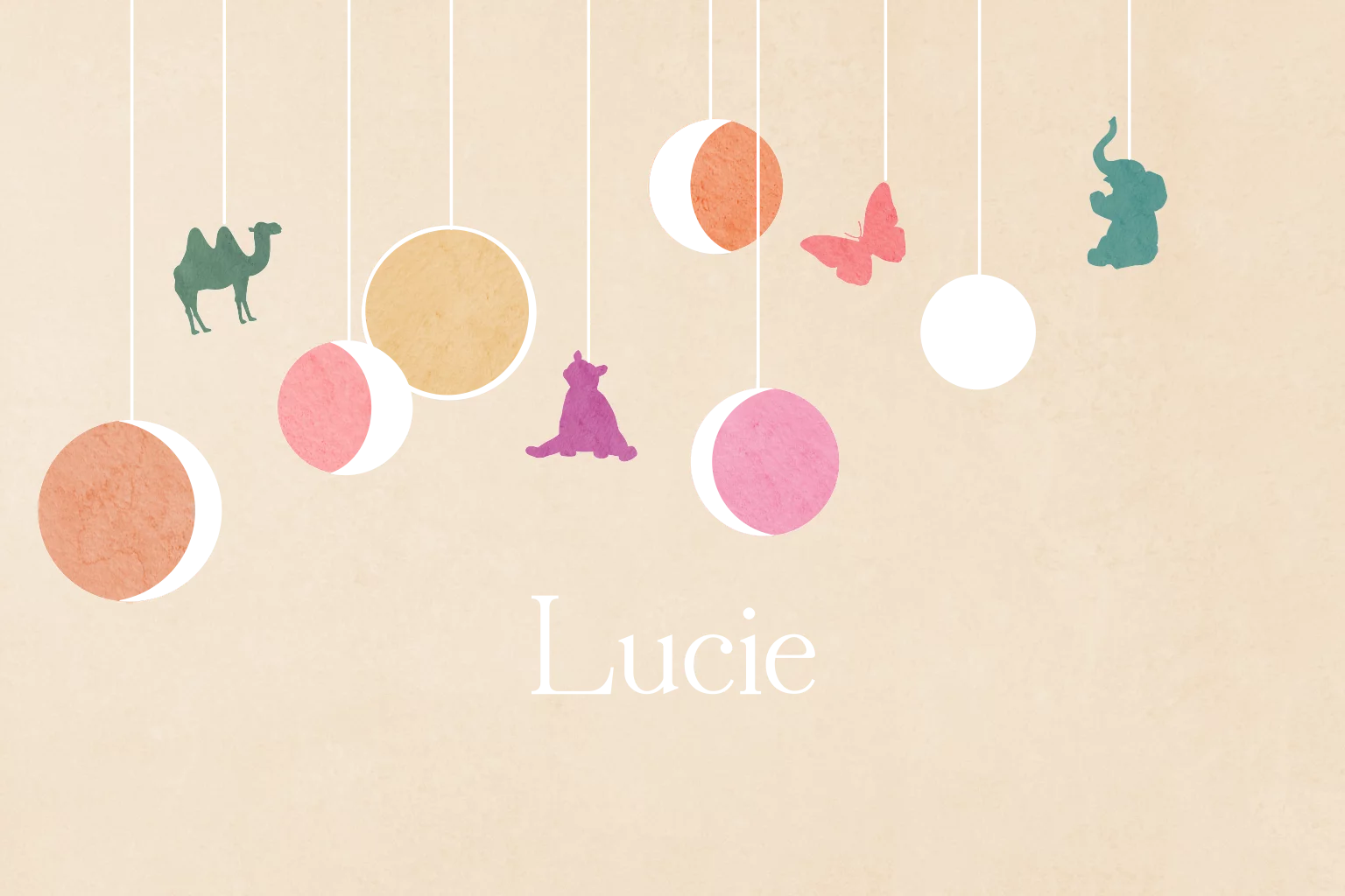 Kleurrijk geboortekaartje met bedeltjes van maanstanden en dieren. De voorkant van het kaartje is bewerkt met mooie goudfolie elementen. Het kaartje heeft ronde hoeken.
