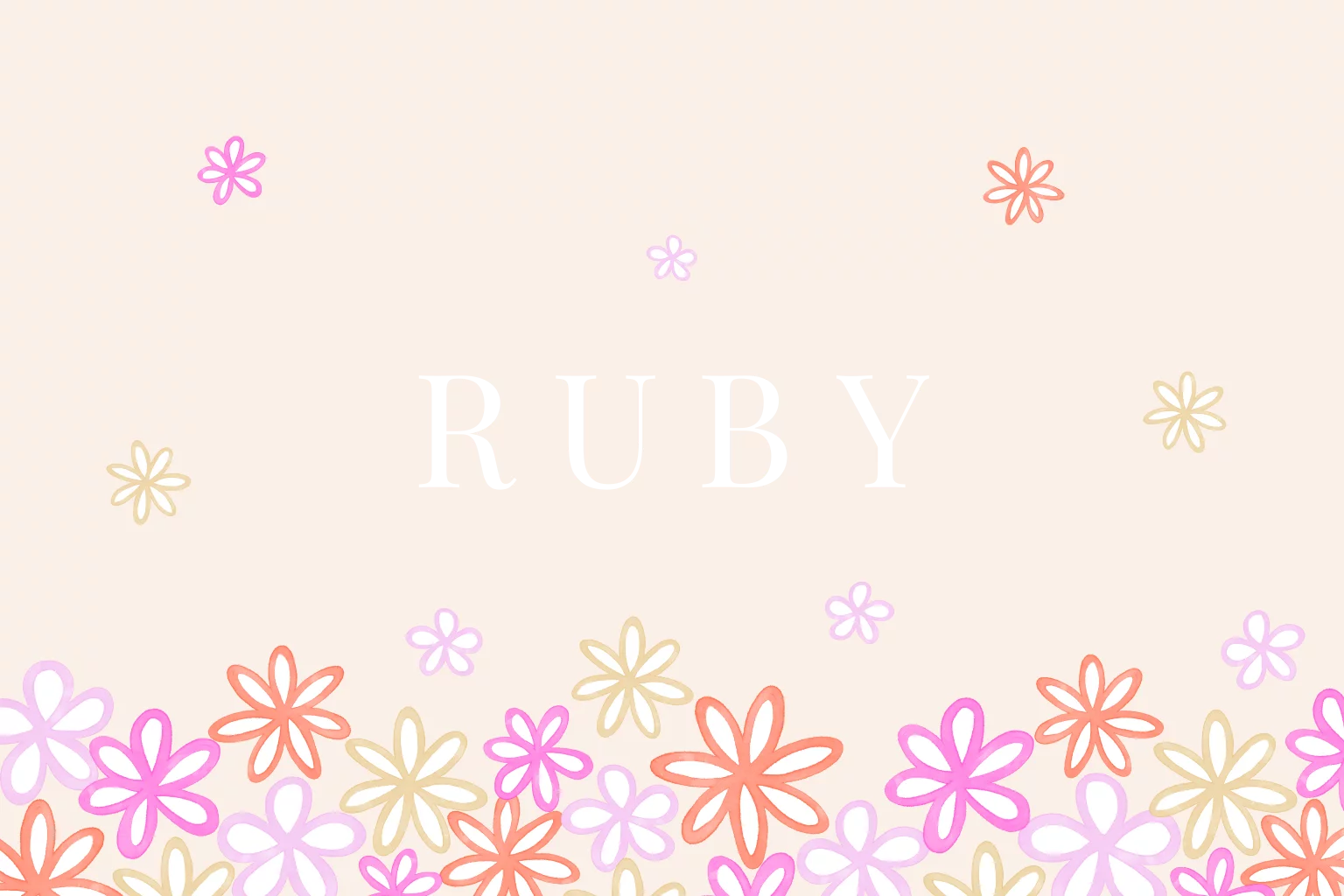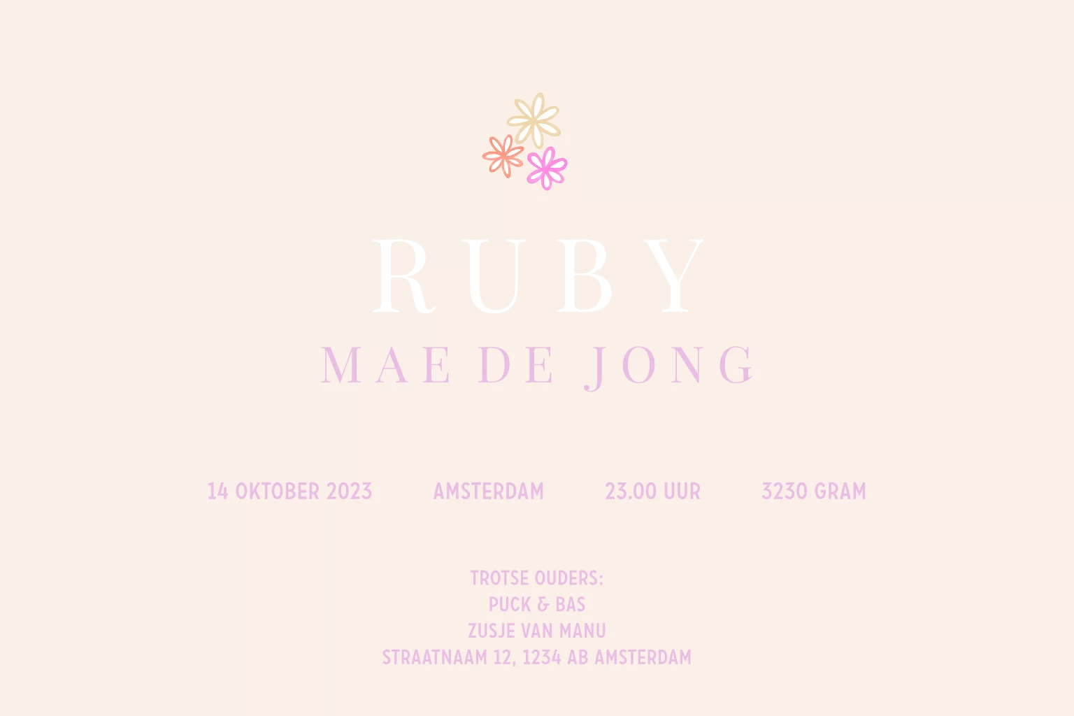 Schattig geboortekaartje met kleurrijke bloemen. De naam is gedrukt in goudfolie.