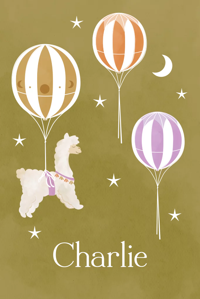 Geboortekaartje van lama met luchtballonnen. Het kaartje heeft mosgroene, lila & oranje kleuren. De geboortekaart is afgewerkt met goudfolie.