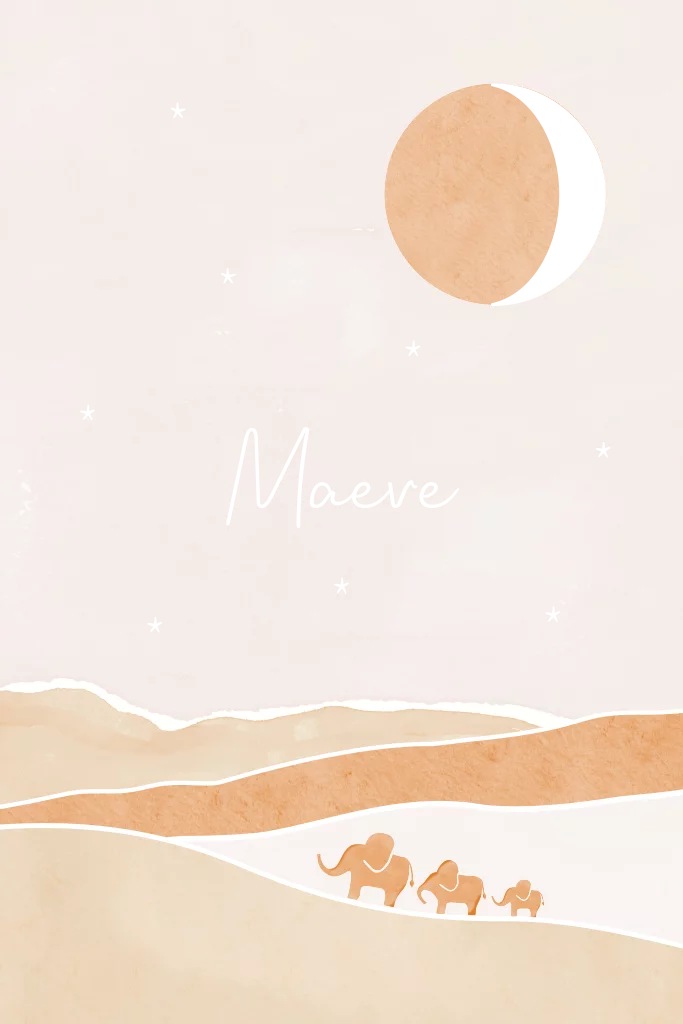 Geboortekaartje met drie olifantjes in een landschap. Het gouden maantje is in de Zon verwerkt. Het kaartje heeft mooie warme aardetinten. Je kunt gemakkelijk zelf een olifantje toevoegen.