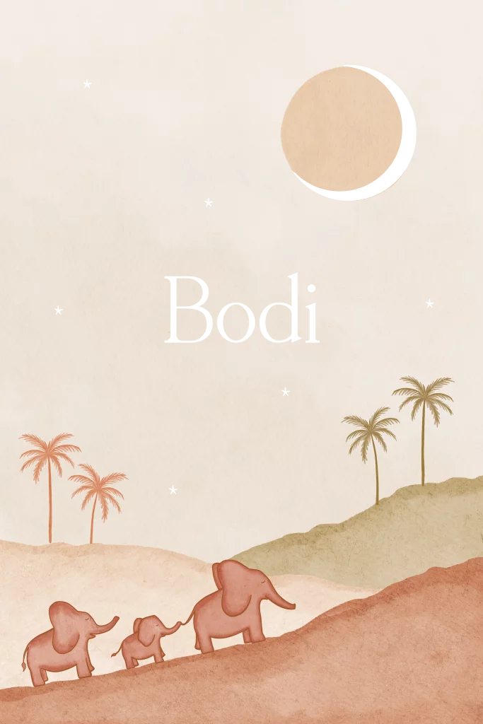 Schattig Geboortekaartje voor een jongen of meisje van een landschap met drie olifantjes in mooie terra en aardetinten. Het kaartje heeft palmbomen en gouden maan en sterretjes, afgewerkt in goudfolie. Liever een andere vorm kaart of kleine aanpassingen? Stuur een mailtje naar hello@bomundi.co