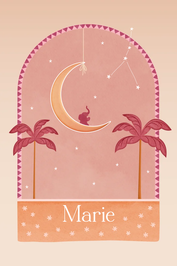 Boog Geboortekaartje olifantje op de maan met palmbomen. Het kaartje is afgewerkt met gouden sterretjes en het sterrenbeeld.