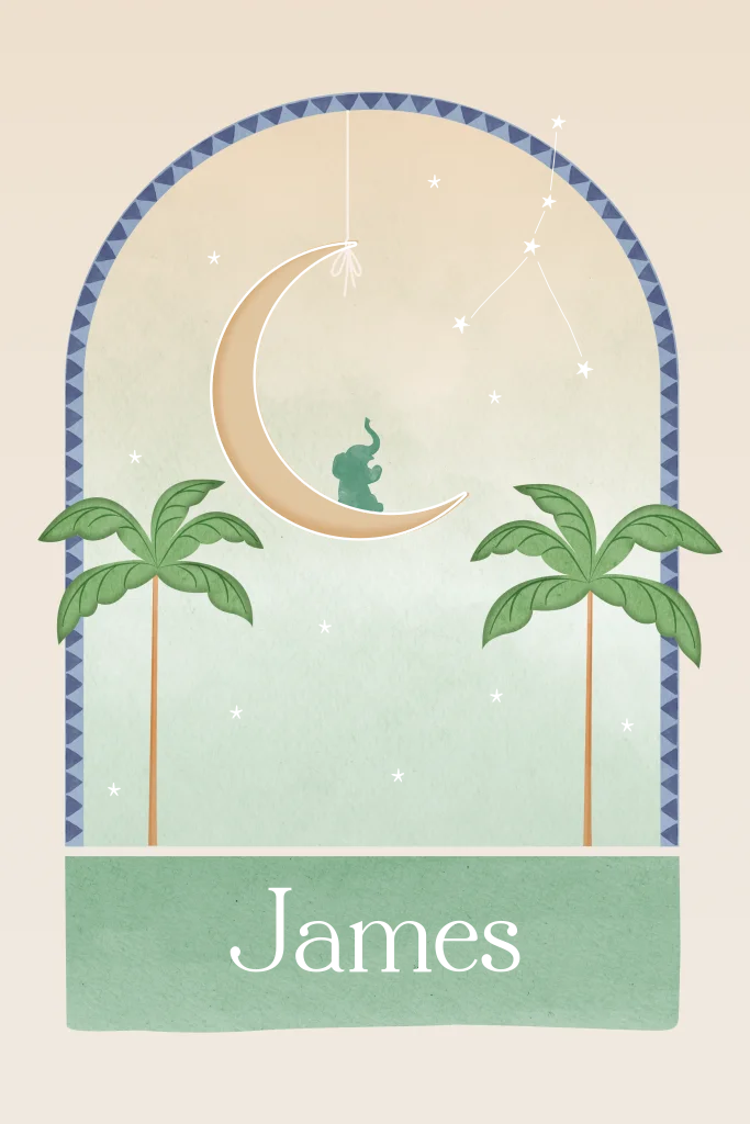 Boog Geboortekaartje olifantje op de maan met palmbomen. Het kaartje is afgewerkt met gouden sterretjes en het sterrenbeeld.