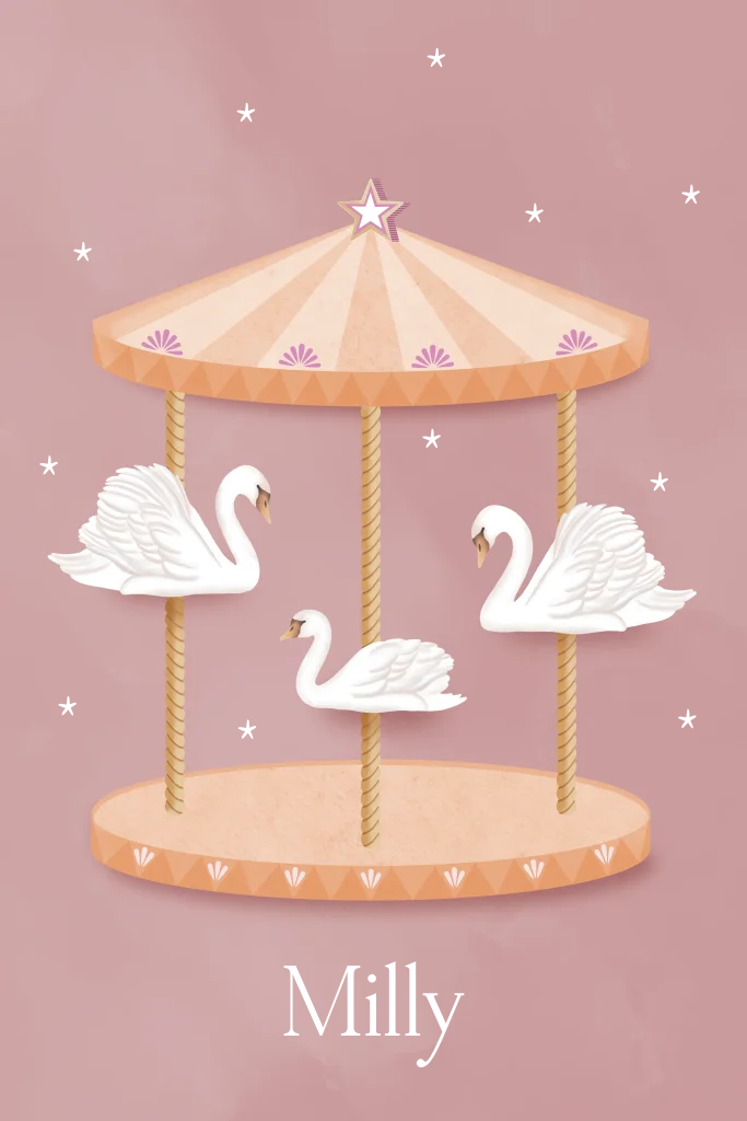 Prachtig geboortekaartje van zwanenfamilie in een draaimolen. De voorkant van het kaartje is afgewerkt met goudfolie. Het kaartje heeft mooie zachte oranje en roze tinten.