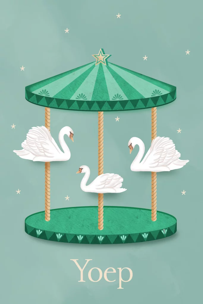 Prachtig geboortekaartje van zwanenfamilie in een draaimolen. Het kaartje heeft mooie groene tinten.