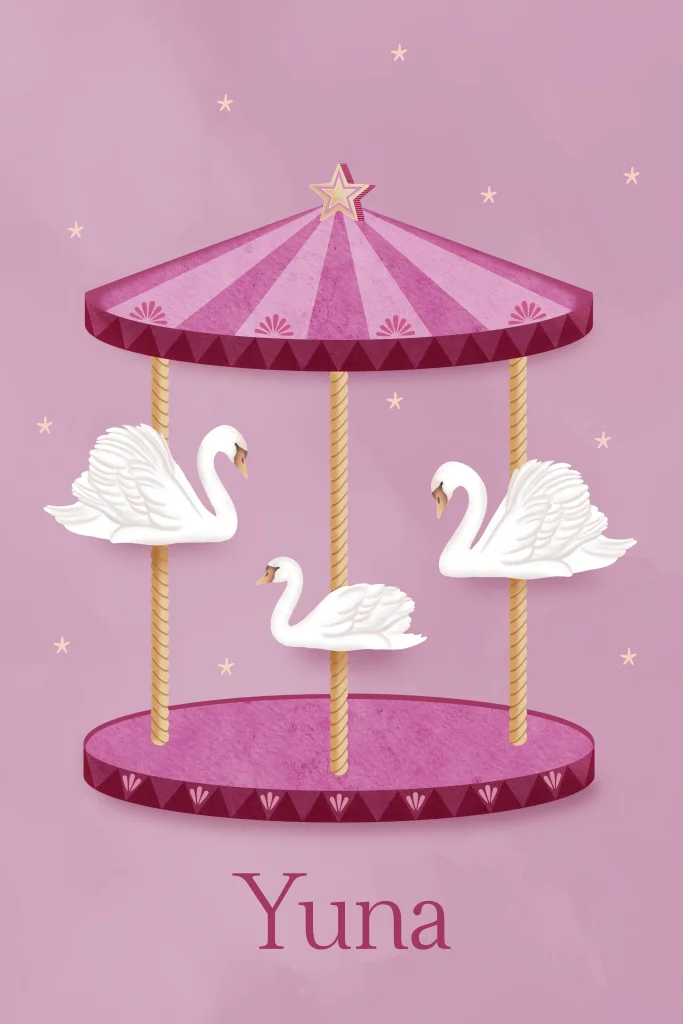Prachtig geboortekaartje van zwanenfamilie in een draaimolen. Het kaartje heeft mooie paarse en roze tinten.