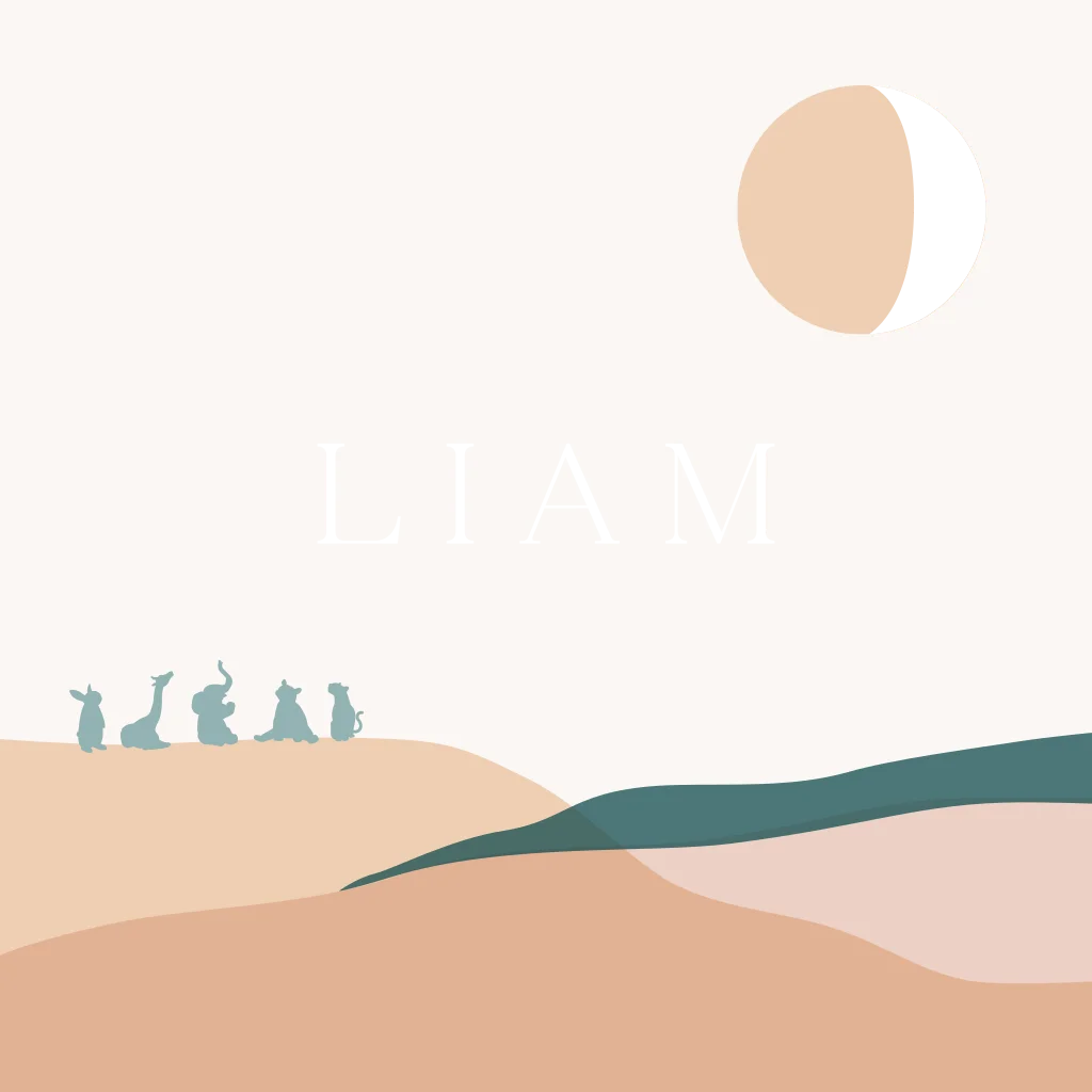 Geboortekaart met silhouette van dieren in een landschap met een maantje verwerkt in de zon. De zon en de naam zijn gedrukt in goudfolie.