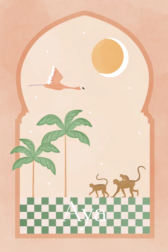 Mooi geboortekaartje met een boog in de vorm van Arabische poort. Het kaartje heeft groene en peach kleuren. Het kaartje heeft een flamingo en aapjes. De sterren en het maantje zijn bewerkt met goudfolie.