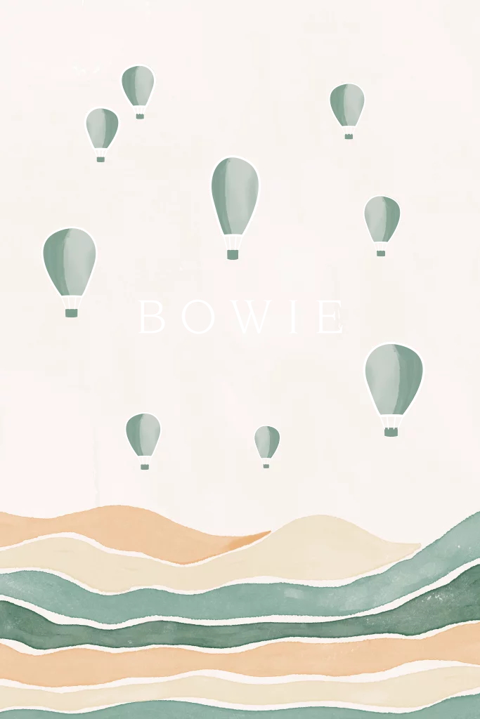 Schattig geboortekaartje met groen landschap met luchtballonnen. Zowel de naam als het randje van de luchtballonnen worden gedrukt in goudfolie.