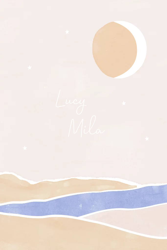 Prachtig geboortekaartje voor een tweeling. Het landschap heeft pastelkleuren en is afgewerkt met sterretjes en een maan.