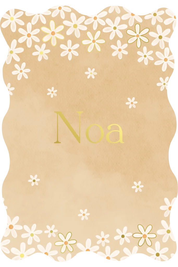 Lente geboortekaartje met Madeliefjes uitgesneden in golvende vorm in mooie geel en oranje tinten. Van dit geboortekaartje met bloemetjes word je meteen vrolijk. De bloemetjes en de naam zijn afgewerkt in goudfolie.