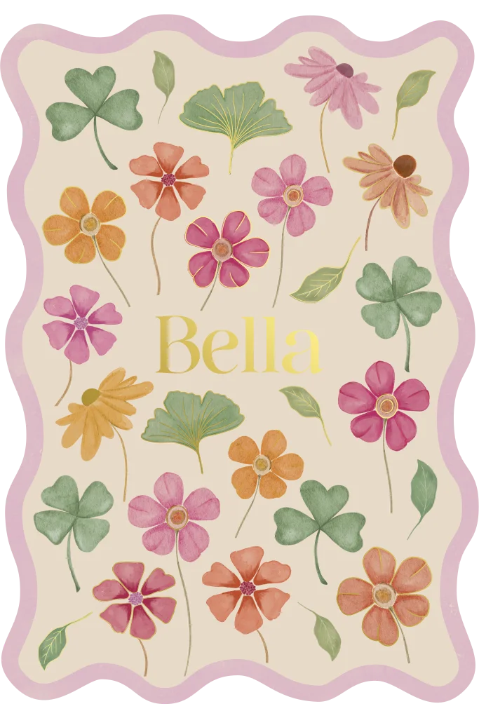Mooi geboortekaartje met bloemetjes, klavertjes vier en bladeren in mooie lentekleuren. Het geboortekaartje is afgewerkt met goudfolie en wordt uitgesneden in speelse golfvorm.