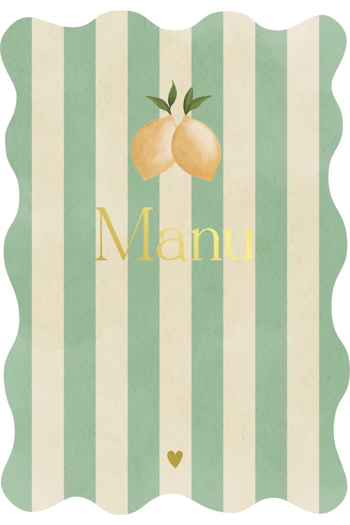 Bijzonder geboortekaartje met citroenen, en hippe verticale groen & beige strepen. Het geboortekaartje is afgewerkt met goudfolie en wordt uitgesneden in een mooie golfvorm.