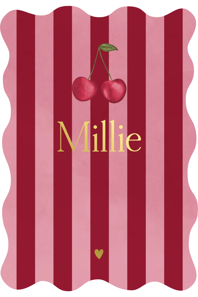 Bijzonder geboortekaartje met kersen, en hippe verticale roze & rode strepen. Het geboortekaartje is afgewerkt met goudfolie en wordt uitgesneden in een mooie golfvorm.