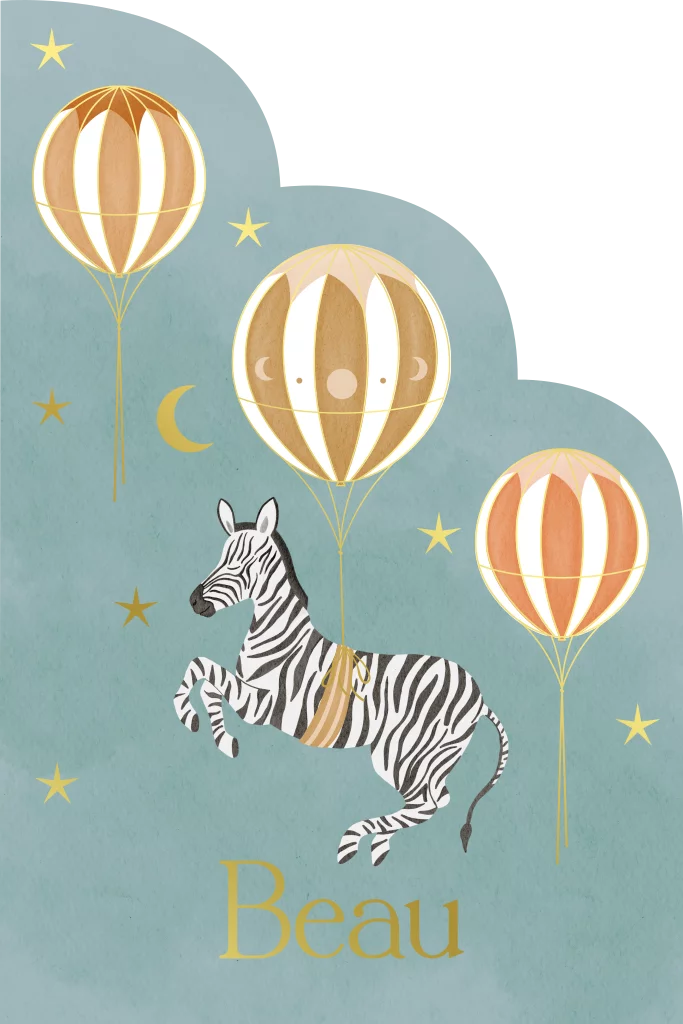 Bijzonder geboortekaartje met zebra en luchtballonnen in mooie blauwe en oker tinten. Naam en sterren en maantje zijn afgewerkt met goudfolie. Dit geboortekaartje wordt uitgesneden in een unieke vorm met boogjes, wat het echt een bijzonder geboortekaartje maakt.