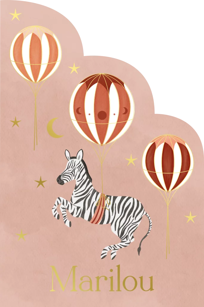 Meisjes geboortekaartje met zebra en luchtballonnen in mooie roze en rode tinten. Naam en sterren en maantje zijn afgewerkt met goudfolie. Dit geboortekaartje wordt uitgesneden in een unieke vorm met boogjes, wat het echt een bijzonder geboortekaartje maakt.
