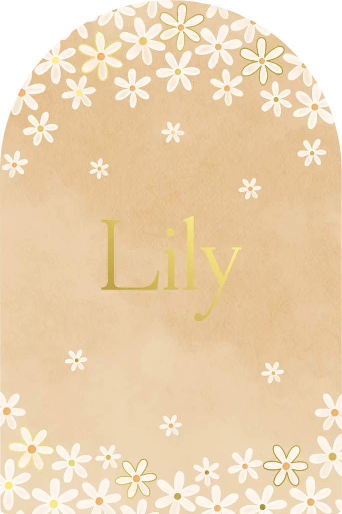 Lente geboortekaartje met Madeliefjes uitgesneden in boogvorm in mooie geel en oranje tinten. Van dit geboortekaartje met bloemetjes word je meteen vrolijk. De bloemetjes en de naam zijn afgewerkt in goudfolie.
