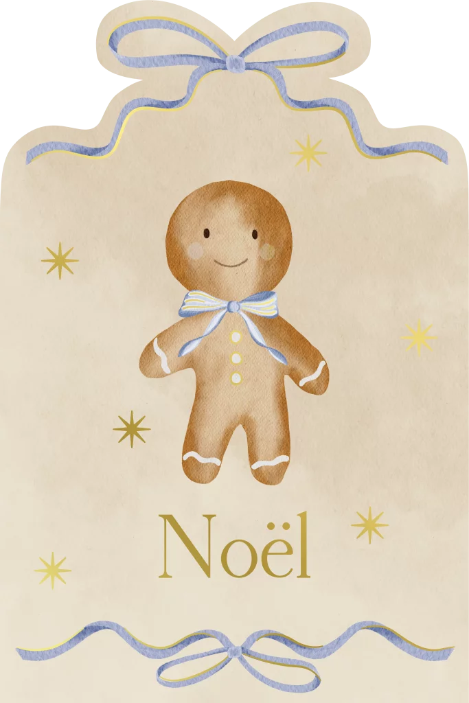 Verwacht je een kindje in de Decembermaand? Dan is dit kerstmis ontwerp met schattig gingerbread-poppetje een perfect geboortekaartje voor een jongen. Het kaartje heeft lichtblauwe en gouden accenten en de strik maakt het een feestelijk geheel. Het kaartje wordt uitgesneden in een unieke vorm in stijl van een strik, wat het kaartje een extra bijzondere uitstraling geeft.