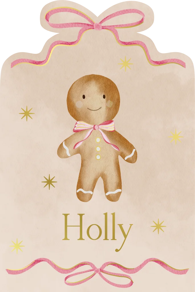 Verwacht je een kindje in de Decembermaand? Dan is dit kerstmis ontwerp met schattig gingerbread-poppetje een perfect geboortekaartje voor een meisje. Het kaartje heeft roze en gouden accenten en de strik maakt het een feestelijk geheel. Het kaartje wordt uitgesneden in een unieke vorm in stijl van een strik, wat het kaartje een extra bijzondere uitstraling geeft.