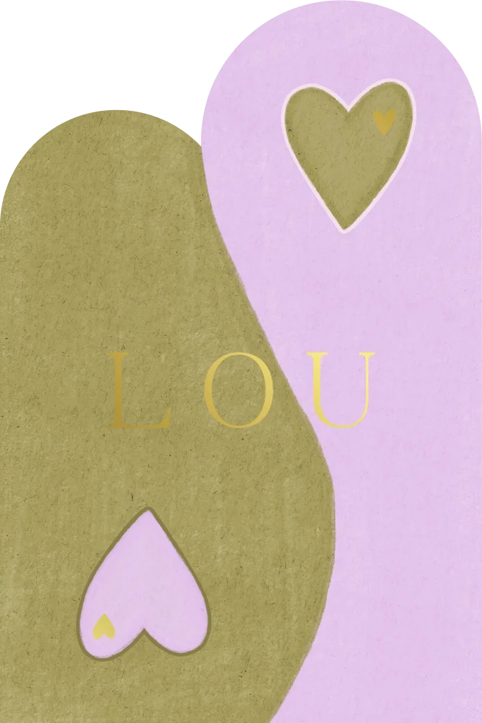 Een uniek geboortekaartje geïnspireerd op het Yin Yang symbool met twee harten. Het geboortekaartje heeft mooie groene en lila tinten en is leuk voor jongens en meisjes. De hartjes zijn afgewerkt met een klein hartje in goudfolie.