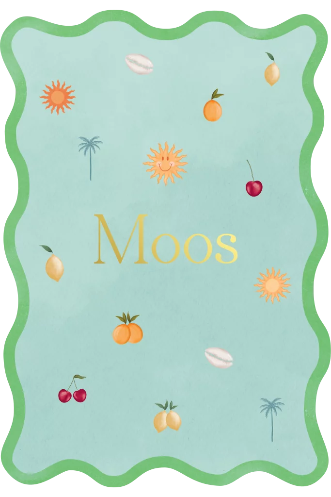 Zomers Geboortekaartje Golfvorm Zon Palmboom Fruit Schelp Groen Blauw